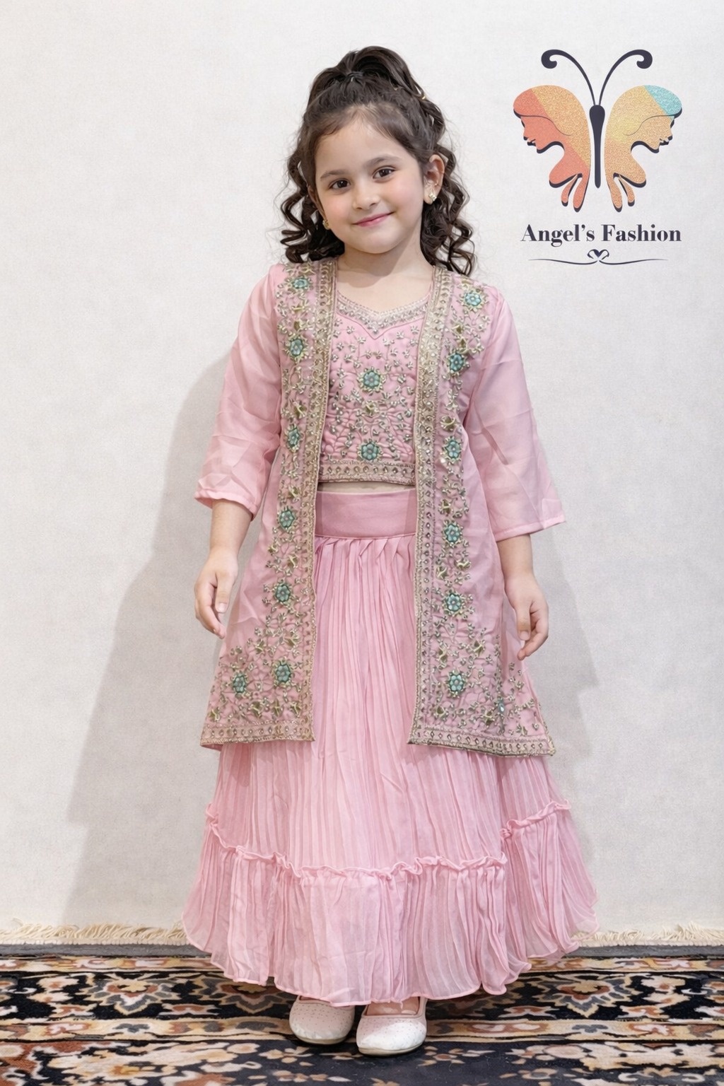 Give your little one a graceful festive look with this beautifully designed girls’ lehenga choli set with shrug, crafted with delicate embroidery and soft pastel tones.