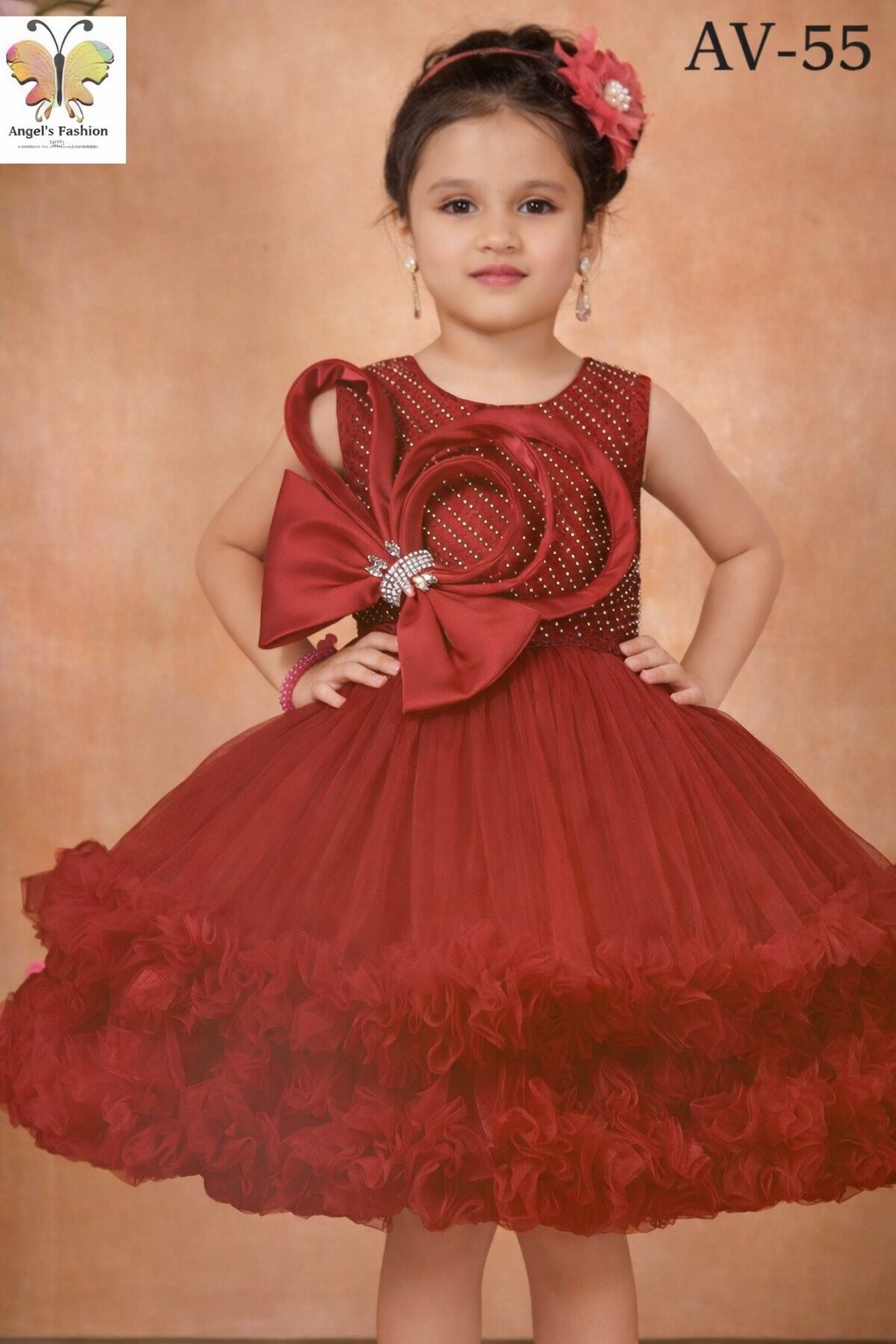 Angel’s Fashion | Deep Maroon Sequined Party Frock with Oversized Bow (AV-55)